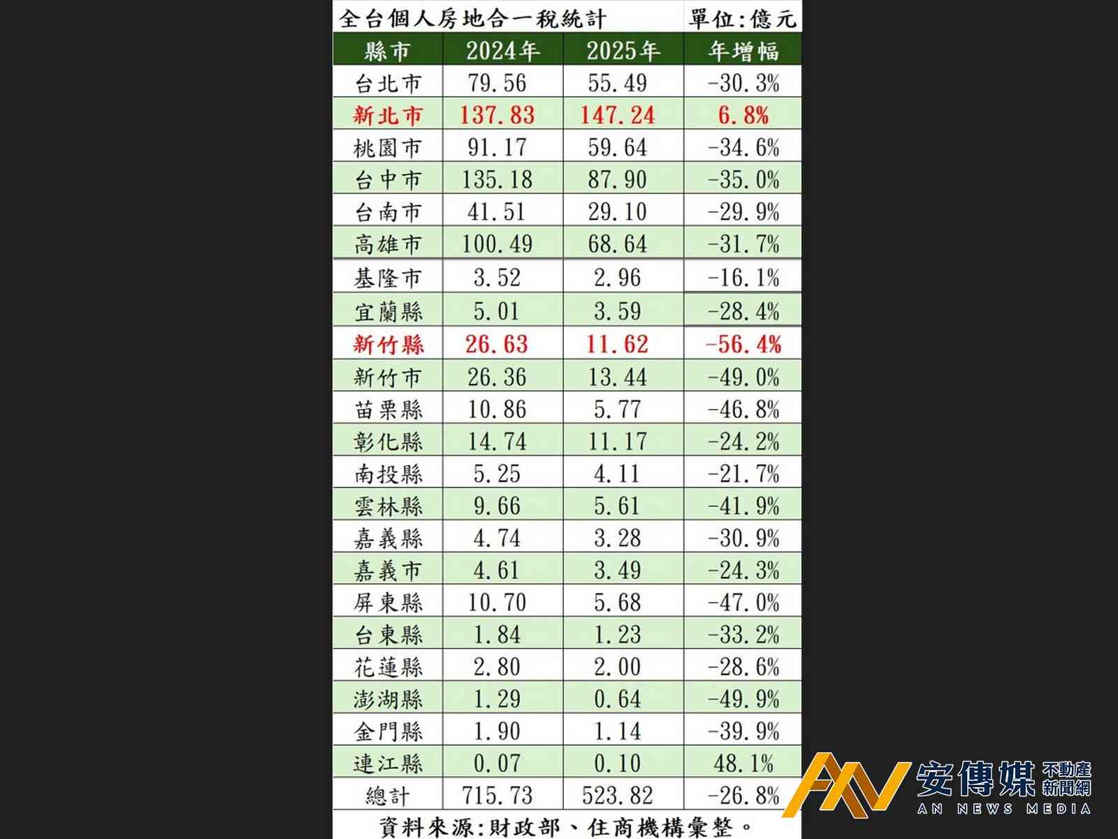【AN不動產新聞網/蕭又安/綜合報導】2025年房市陷入近年來最大低潮,住商機構根據財政部資料,2025年全台個人房地合一稅與2024年相比大跌26.8%,終止該稅上路以來,連續7年飆漲紀錄;此外,全台僅新北市、連江縣正成長,其餘20縣市與2024年相比全數下滑,此紀錄也是首見。大家房屋企劃研究室公關襄理賴志昶指出,象徵屋主售屋獲利多寡的房地合一稅,歷年來首見衰退,意味著房市已正式走入盤整期。