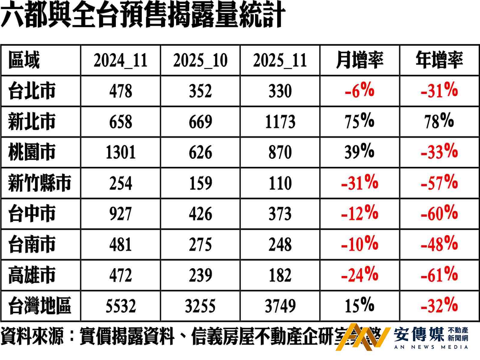 【AN不動產新聞網/蕭又安/綜合報導】信義房屋統計最新預售揭露件數,2025年11月全台房屋成交數據顯示,預售市場表現有觸底反彈跡象,11月全台揭露件數達3,749件,月增15%但年減32%,11月揭露件數寫下近8個月以來新高,顯示房市有觸底反彈的現象,不過仍明顯低於長期均量單月8,000件水準,其中新北市11月揭露千件,超過新竹、台中、台南與高雄四都總量,成為房市還有人氣的小熱區。