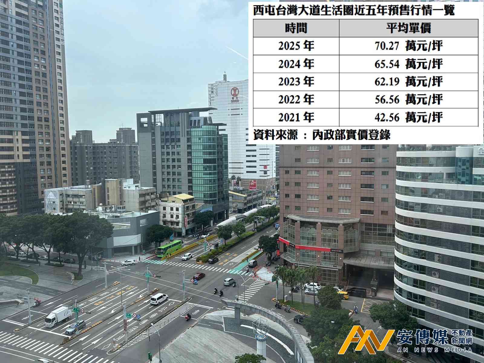根據實價登錄資料統計,西屯台灣大道沿線預售屋均價自2021年每坪42.56萬元,到2025年已成長至每坪70.27萬元,5年間漲幅達65.11%。即使近期整體房市交易量明顯收斂,價格走勢仍展現相對穩健表現,顯示台灣大道作為市中心核心幹道,在市場修正階段仍維持一定的保值與抗跌性。