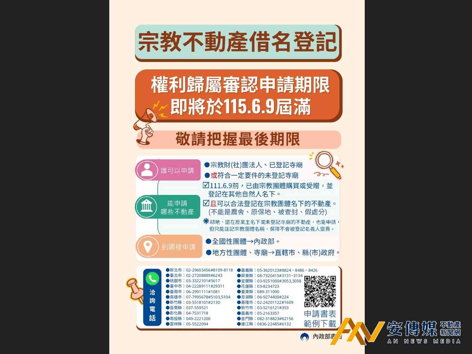 【AN不動產新聞網/方暮晨/綜合報導】為協助宗教團體處理不動產借名登記問題,避免宗教團體的不動產淪為私人財產,內政部表示,政府推動制定的「宗教團體以自然人名義登記不動產處理暫行條例」(以下簡稱暫行條例),有關不動產權利歸屬審認的申請期限,將於2026年6月9日屆滿,呼籲宗教團體把握最後申請期限,及早申辦,以保護宗教團體所有財產,維護自身權益。