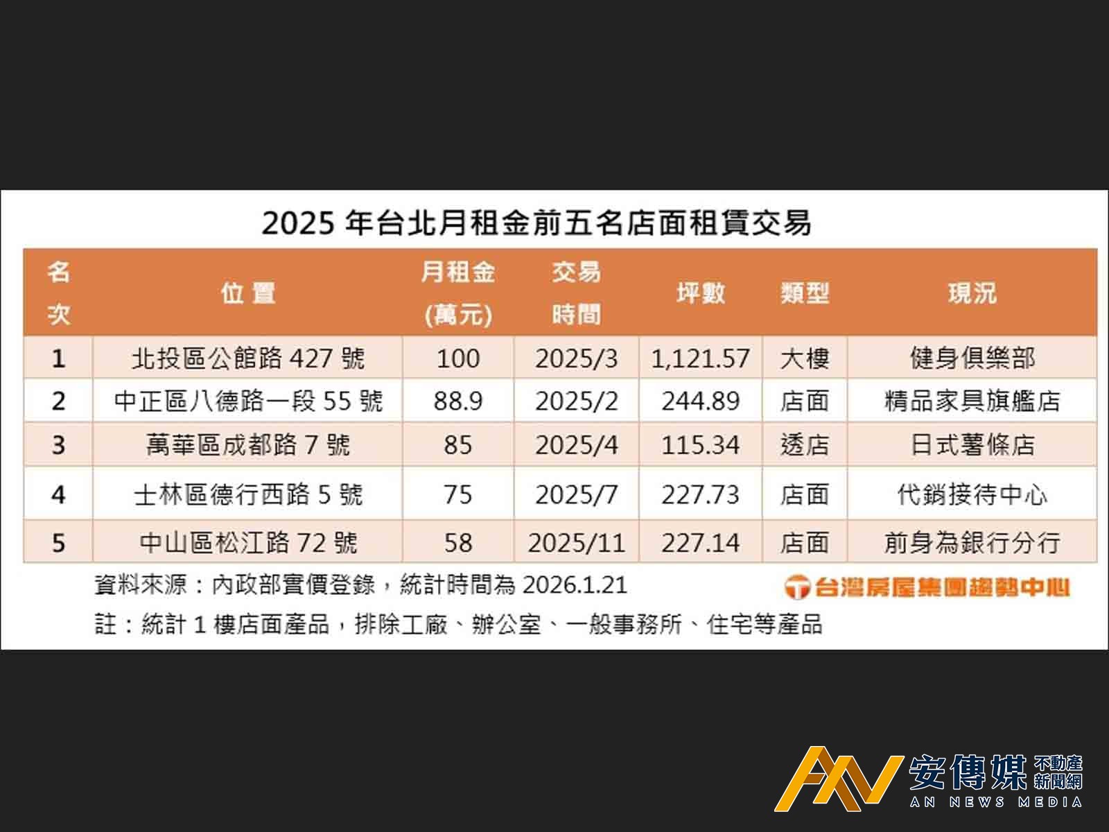 觀察2025年台北市店面月租金最高的店面,不是在東區或西門町,竟在北投區!2025年3月公館路的大樓店面,一樓加地下室總坪數1121.57坪,由健身房業者一次簽下10年租約,以每月100萬元承租。