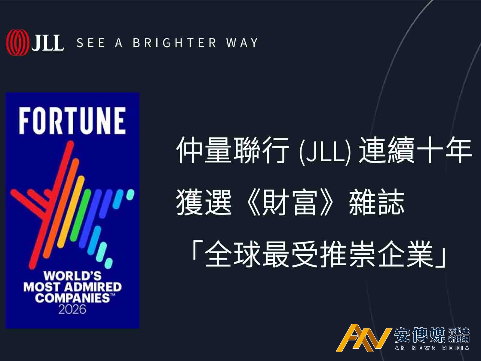 【AN不動產新聞網/蕭又安/綜合報導】全球領先的商用不動產服務與投資管理公司仲量聯行(JLL)宣布,再度榮獲《財富》(Fortune)雜誌評選為2026年「全球最受推崇企業」(World’s Most Admired Companies),並連續第十年榮登榜單,持續獲得全球市場與業界的高度肯定。