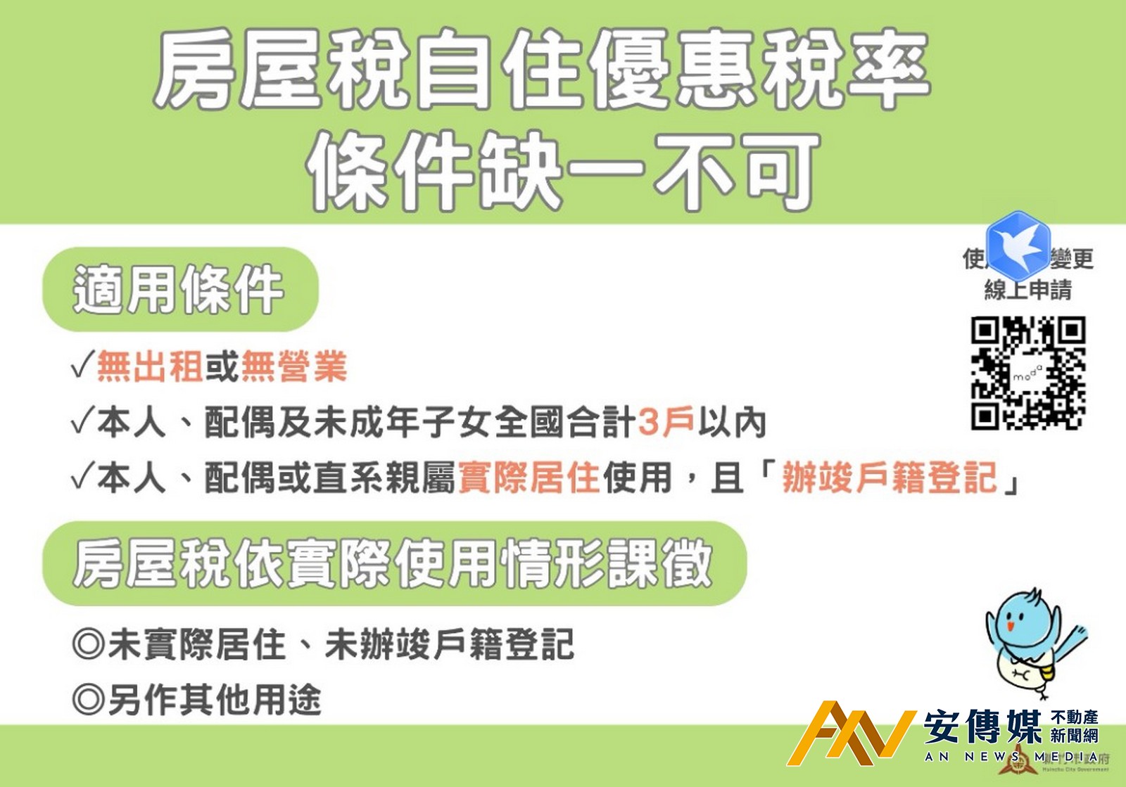 【AN不動產新聞網/劉怡霖/綜合報導】房屋稅2.0新制於2025年5月首次開徵,其中針對自住房屋增訂「辦竣戶籍登記」要件,但實務上仍時常有民眾誤以為,只要遷入戶籍即可適用自住用優惠稅率(1%至1.2%)。新竹市稅務局表示,所謂「自住用」房屋,須同時符合(1)設立戶籍、(2)實際居住、(3)持有戶數等相關規定,並依規定提出申請,經核准後方可適用自住用優惠稅率。