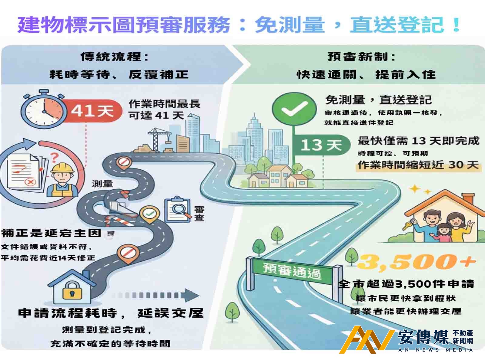 【AN不動產新聞網/劉怡霖/綜合報導】為了讓市民在購屋後能更快取得權狀、順利交屋,台北市地政局宣布,「建物標示圖預審服務」歷經一年多的試辦,已於2026年1月1日正式上線。這項新制主打「免送測量、直接登記」,將原本耗時的行政流程大幅縮短。根據大安地政事務所統計,透過預審機制的案件,從測量到登記審查完成僅需13天,較傳統流程節省約30天,展現顯著的行政效率。
