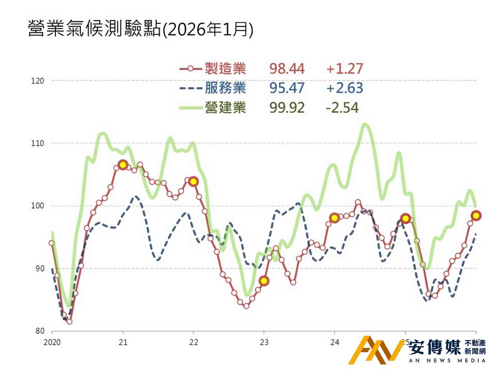 【AN不動產新聞網/蕭又安/綜合報導】台灣經濟研究院公布最新景氣動向調查,2026年1月國內經濟呈現「製造業、服務業續揚,營建業獨憔悴」的局面。其中,不動產市場受限於(1)信用管制、(2)高房貸利率、(3)價格認知差距等三大重壓,交易量能持續疲弱;營造業則受新制上路干擾,景氣暫呈持平,僅靠科技廠辦建廠需求支撐動能。