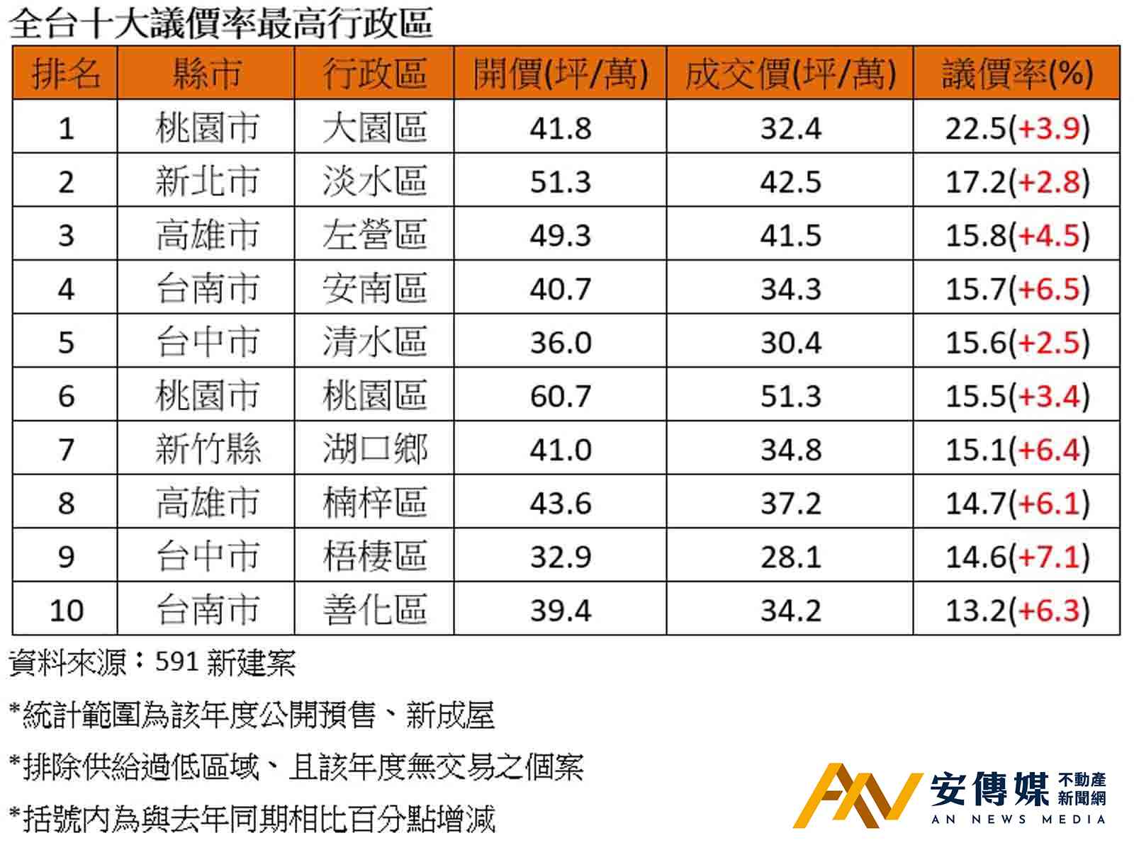 【AN不動產新聞網/蕭又安/綜合報導】根據591新建案統計,全台前十大行政區議價率較2025年普遍增加。其中桃園市大園區以22.5%的議價率居冠,相較2025年成長3.9個百分點,換句話說,「開價打八折」已成當前議價起手式。此外,台中海線清水、梧棲也雙雙入榜,顯然在龐大賣壓進逼下,建商態度明顯鬆動,相較過往房價只漲不跌,如今「軟房價」的態勢相當明顯。