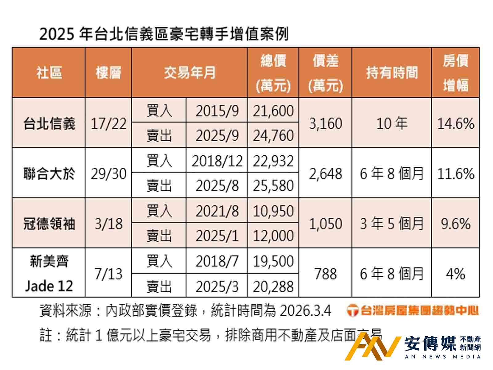 信義區豪宅2025年轉手增值的案例還包括「聯合大於」高樓層戶,2025年8月屋主以約2億5580萬元賣出,對照2018的購入價格2億2932萬元,持有6年多增值2,648萬元;屋齡已19年的「冠德領袖」,低樓層戶屋主僅持有3年多,房產增值1,050萬元;近象山的「新美齊Jade 12」,中樓層屋主持有6年多,則增值788萬元。