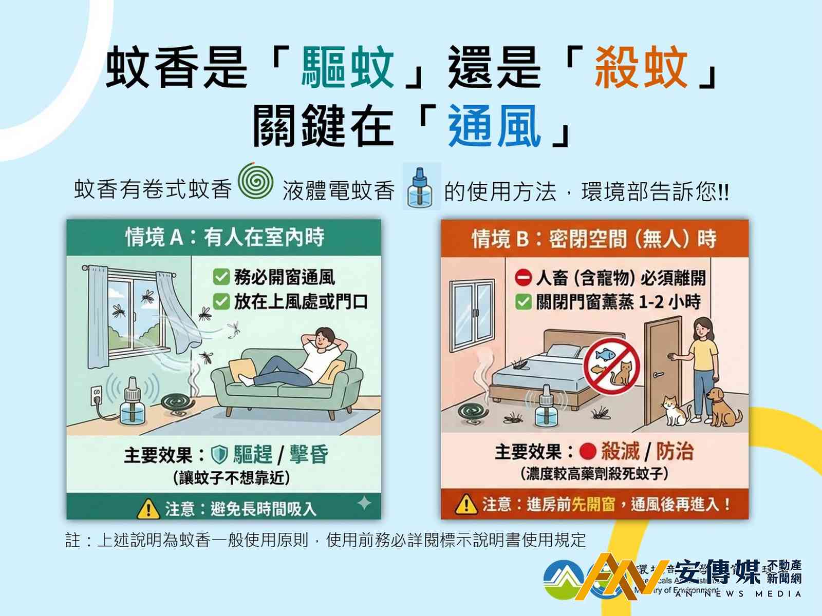 【AN不動產新聞網/方暮晨/綜合報導】天氣轉熱,蚊蟲擾人,許多民眾習慣使用蚊香來換取一夜好眠,並以為用了蚊香就能將蚊子全數殺光。環境部提醒,常見蚊香有液體電蚊香、卷式蚊香二種,主要成分多為除蟲菊精類,效果取決於使用環境的「通風程度」與「密閉與否」,民眾應掌握「人若在室內要通風」、「人畜離開才密閉」的正確觀念,才能安全又有效。
