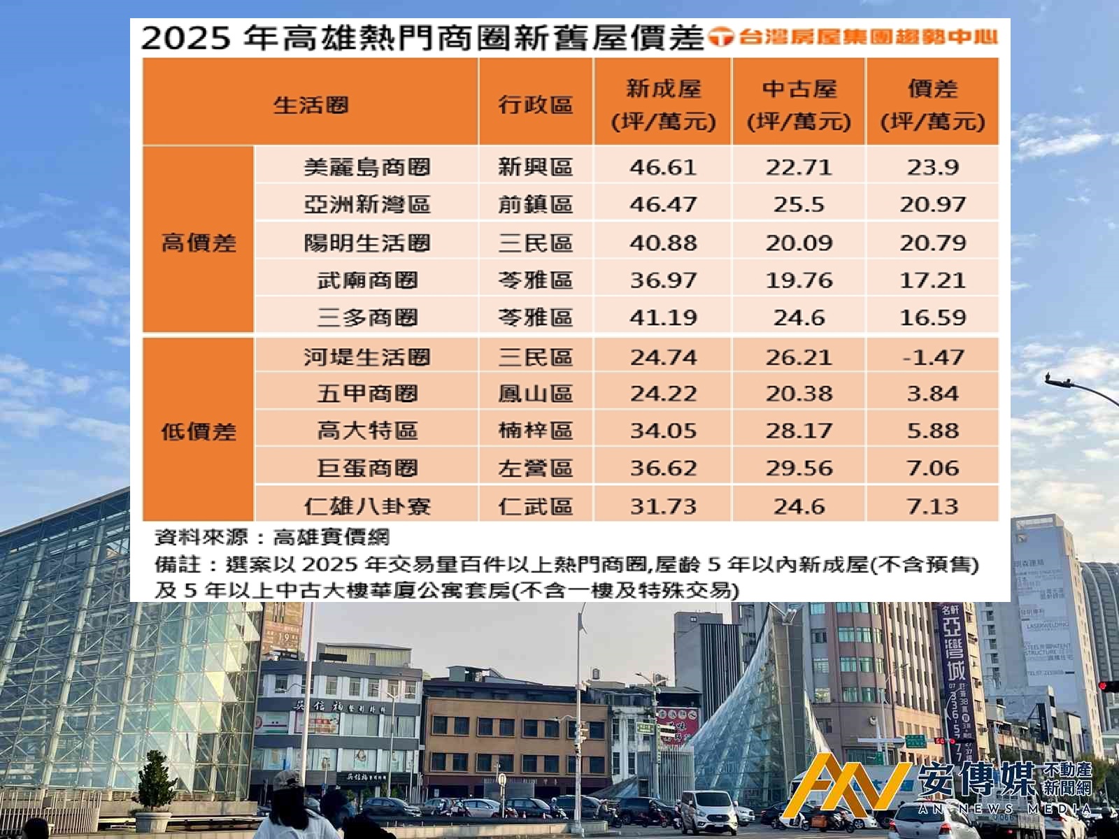 【AN不動產新聞網/蕭又安/綜合報導】買新不如買舊?!台灣房屋集團根據高雄實價網資料統計,2025年高雄各大熱門商圈新舊屋價差表現,其中以美麗島商圈新舊屋價差最明顯,該區5年內新成屋平均單價高達約46.6萬元,而中古屋均價僅約22.7萬元,新舊屋平均單價落差達23.9萬元,新屋單價幾乎是中古屋的兩倍,位居高價差生活圈榜首,其次為亞洲新灣區與陽明生活圈,新舊屋每坪價差均超過20萬元。