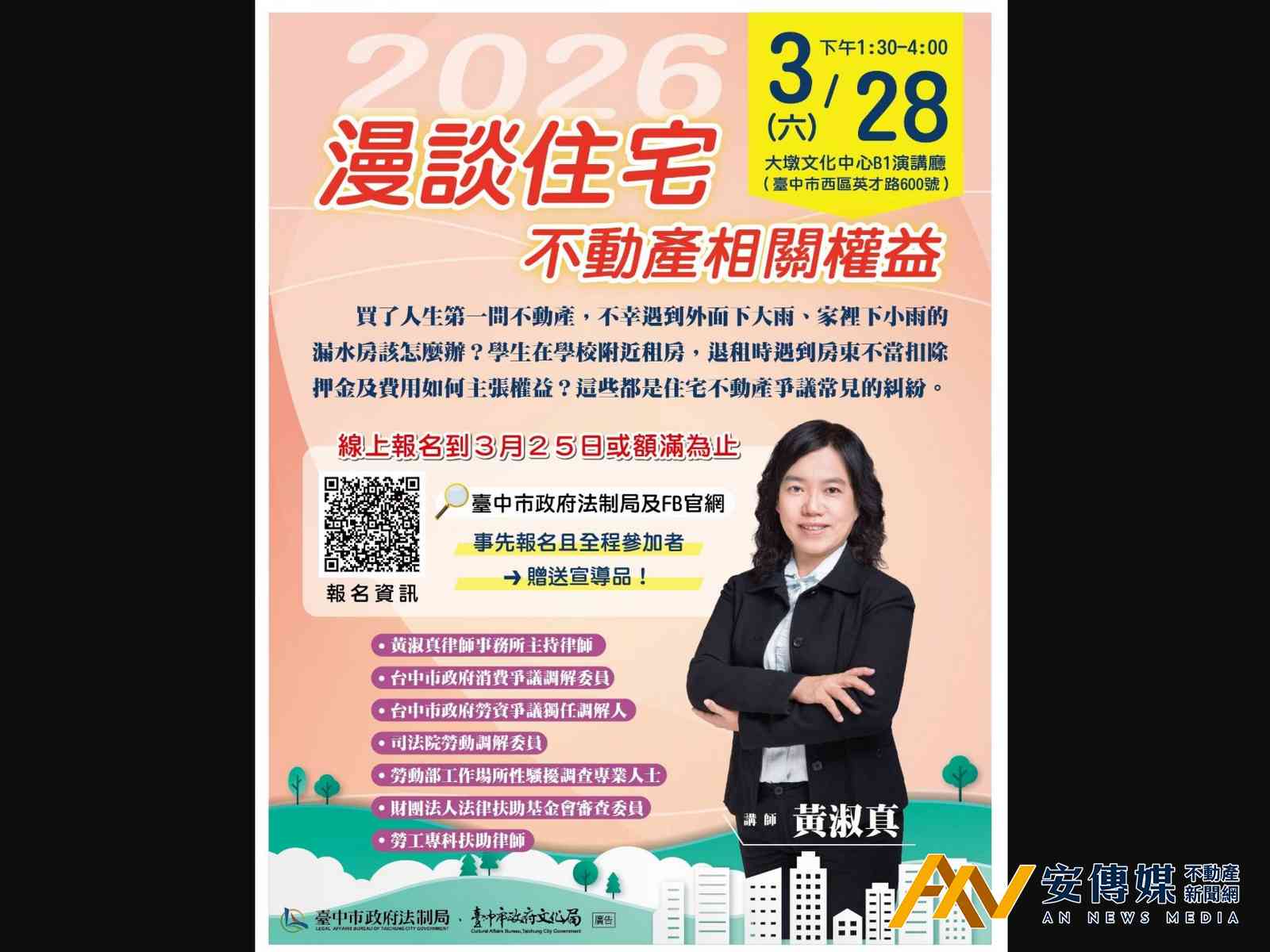 【AN不動產新聞網/劉怡霖/綜合報導】辛苦多年存下人生第一桶金,滿心期待買下夢想屋卻遇到房屋漏水,該如何求償?學生租屋族準備退租開啟新生活,卻被房東以各種理由扣抵押金,又該如何主張權益?這些都是住宅消費糾紛常見的問題。為了讓市民瞭解住宅相關權利義務,台中市政府法制局與文化局特別聯手,邀請消費爭議調解專家「黃淑真律師」,於3月28日下午1時30分至4時10分,在大墩文化中心分享多年實務經驗,協助市民避開交易陷阱。