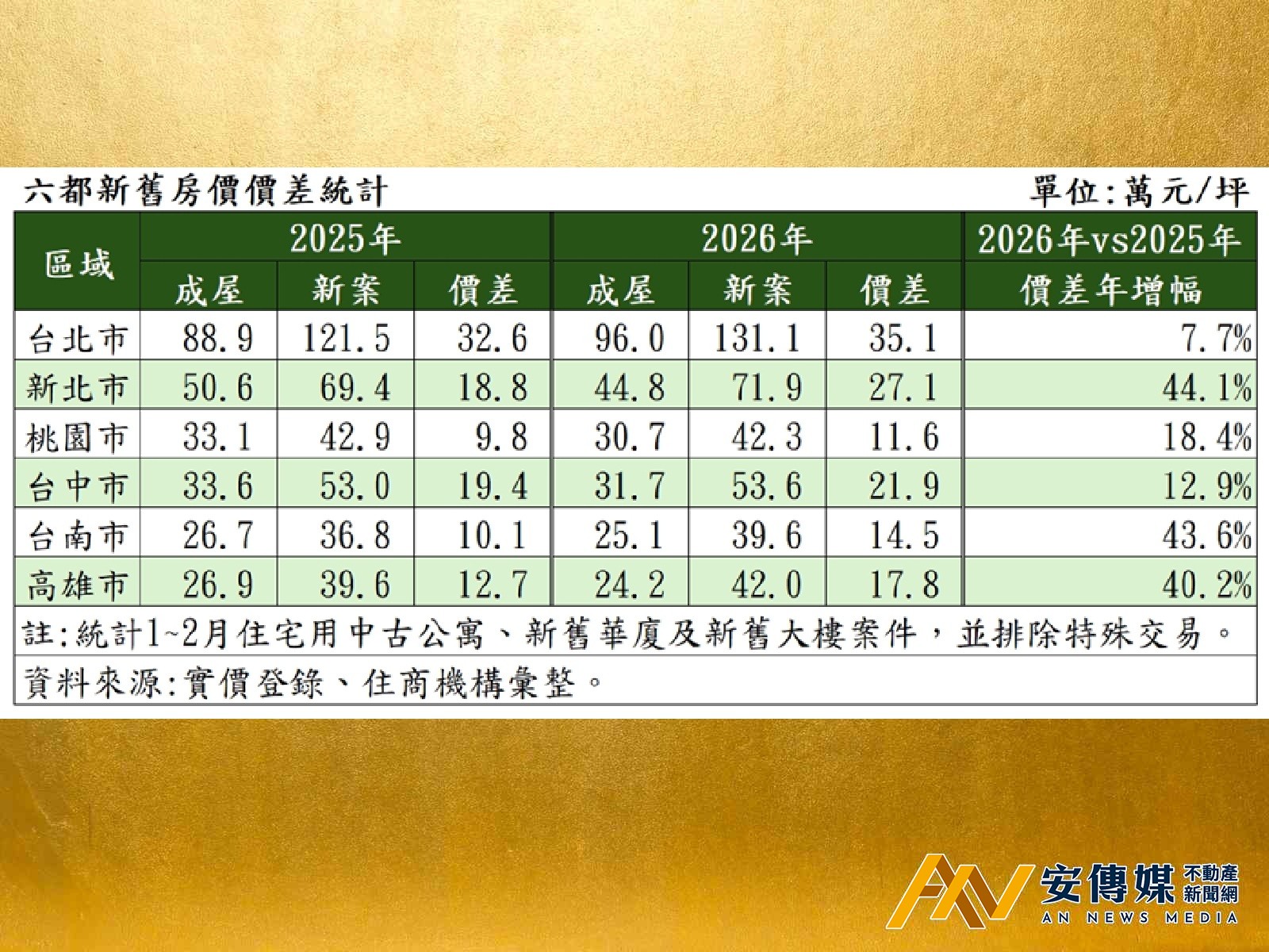 【AN不動產新聞網/蕭又安/綜合報導】全台房市雖說買氣冷凍,惟預售案價格聞風不動,但也令新舊屋價差持續擴大。住商機構統計實價資料,六都2025年1至2月新舊案每坪單價價差,除台北市之外,普遍價差僅約10萬元上下,惟至2026年六都價差更深,其中新北市價差更成長44.1%來到27.1萬元;至於新舊價差最大仍屬北市,同樣購置30坪物件,買二手屋相比買新案能省1,053萬元。大家房屋企劃研究室公關襄理賴志昶分析,相對建商價格鐵板一塊,面臨大環境變遷,中古屋主心態已率先調整,造就新舊案價差飆升。