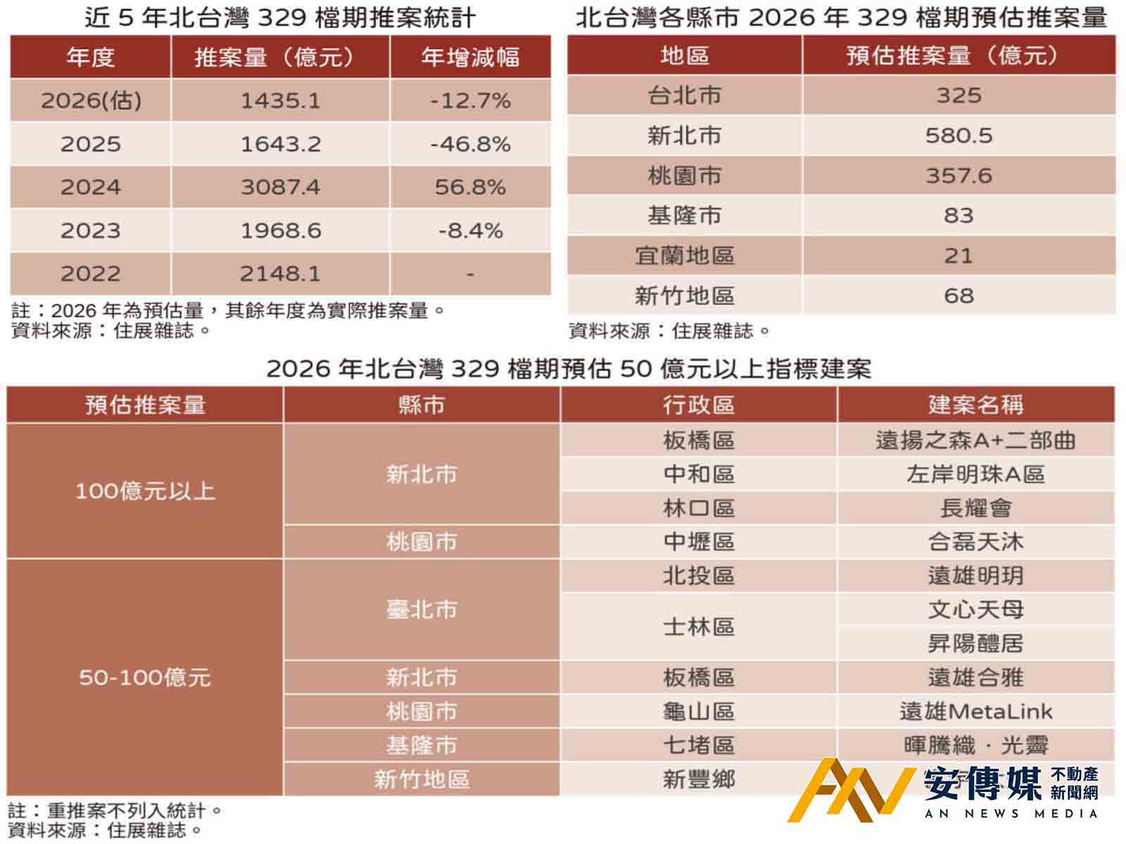 【AN不動產新聞網/蕭又安/綜合報導】住展雜誌統計2026年北台灣新案329檔期推案預估量,房市冷氣團未散,建商進場腳步緩慢,落至約1435.1億元,創15年以來新低,上次低檔為2011年的1369億元,較2025年同期已為低迷衰況再減208.1億元,年減12.7%。