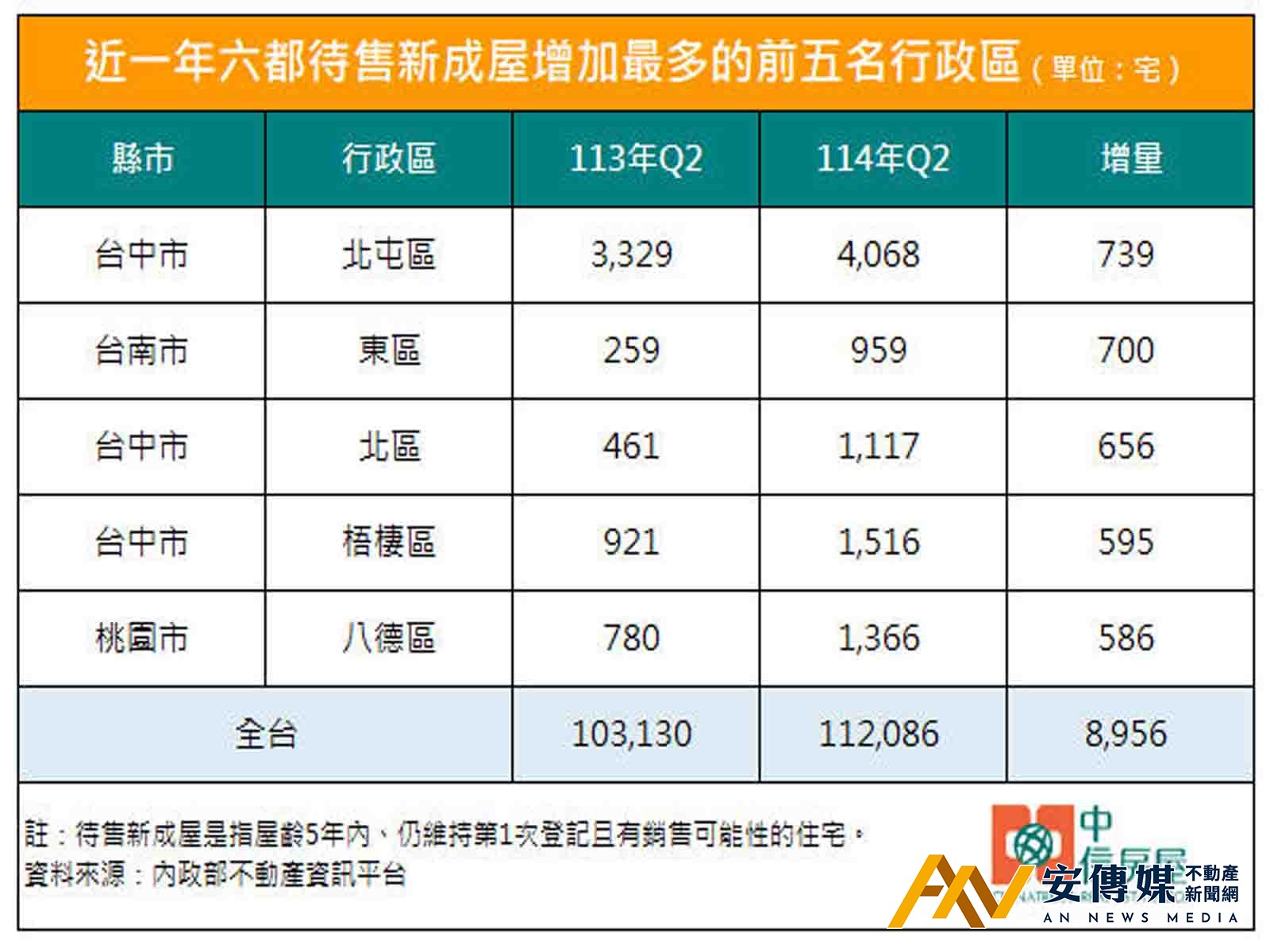 【AN不動產新聞網/蕭又安/綜合報導】房市景氣降溫,新建案市場也在面臨相當大的挑戰。根據內政部不動產資訊平台最新數據顯示,截至2025年第二季,全台「待售新成屋」已達112,086宅,創下歷史新高,與2024年同期的103,130宅相比,短短一年就激增近9千宅。若進一步觀察六都各行政區的表現,近一年待售新成屋增加最多的前五名行政區,依序分別是台中市北屯區、增加739宅,台南市東區、增加700宅,台中市北區、增加656宅,台中市梧棲區、增加595宅,桃園市八德區、增加586宅。光是這五大行政區的合計增量就高達3,276宅、占全台新增待售新成屋的37%,顯見以上區域新建案的去化壓力已逐漸浮現。