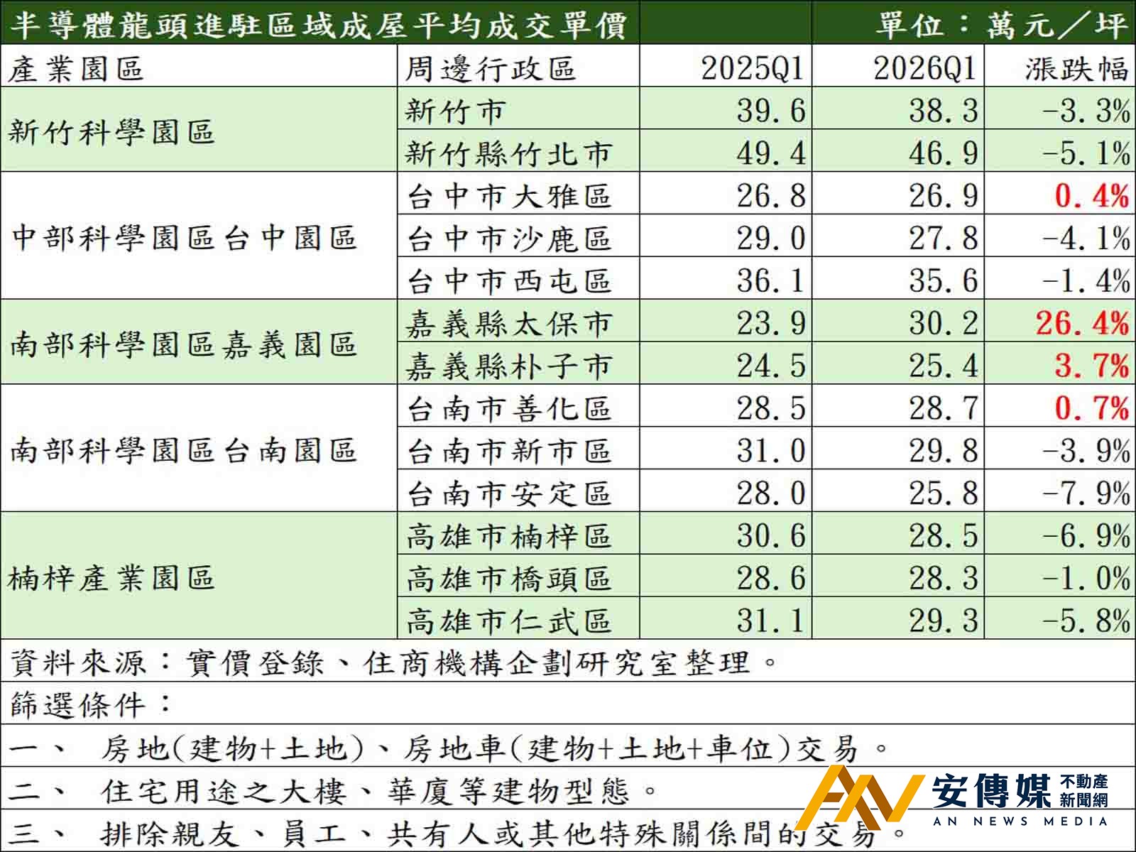 【AN不動產新聞網/蕭又安/綜合報導】台股2026年4月27日在半導體龍頭類股帶動下,衝破4萬點大關,不過卻未出現「股房連動」現象。住商機構彙整實價登錄數據,2026年第一季全台有半導體龍頭進駐的五大科學園區中,僅南部科學園區嘉義園區周邊行政區呈現明顯漲勢,其餘行政區要不平盤、要不出現盤整。大家房屋企劃研究室公關襄理賴志昶指出,過去「園區宅」議題火熱,吸引投資置產族群,惟打房與限貸衝擊加劇,令以往漲多區域,多有回跌現象。
